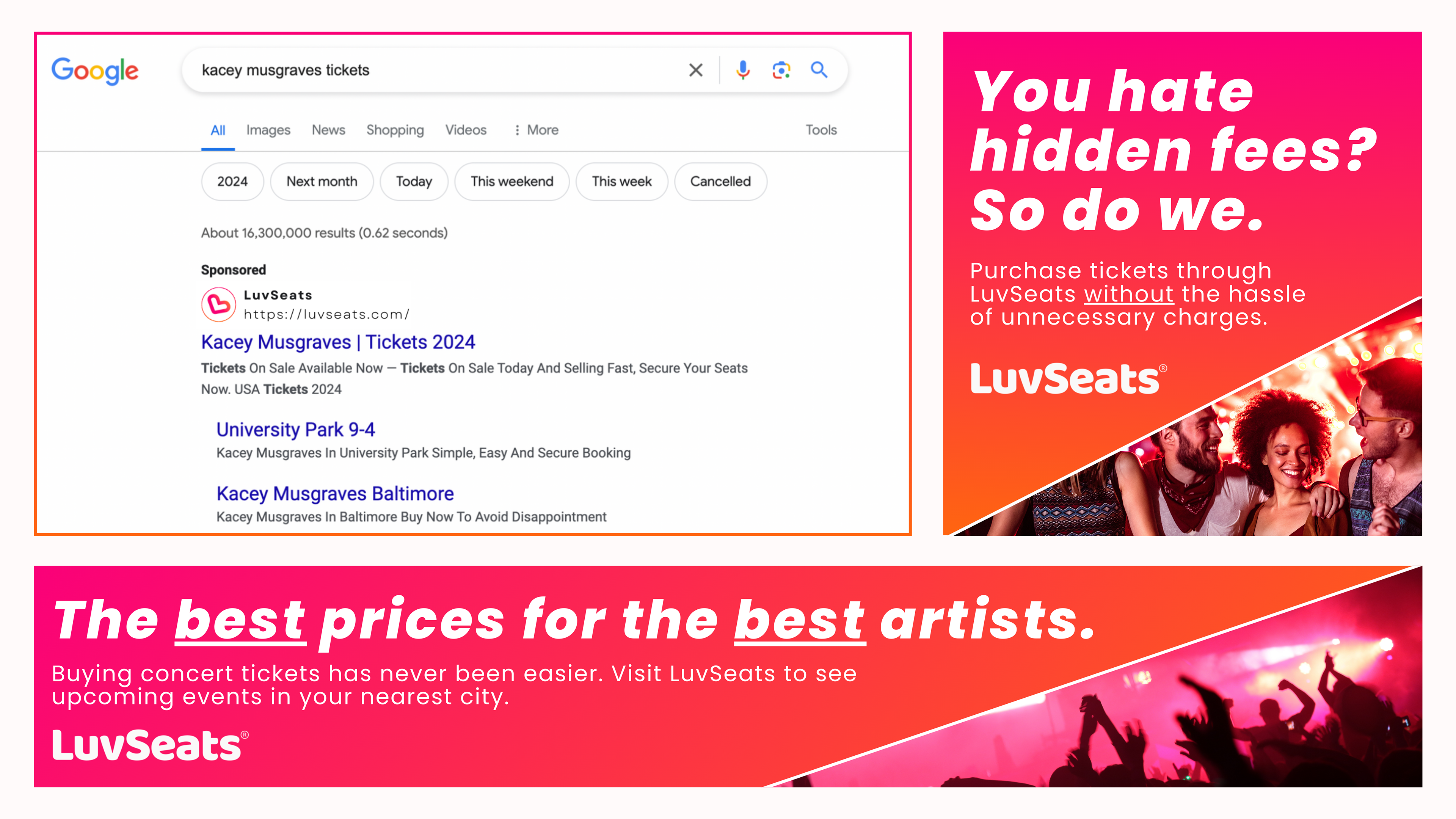 During the spring semester of the '23 to '24 academic year, my teammates and I were tasked to develop a marketing strategy for LuvSeats, a ticket-purchasing website for concerts, events, and more. Our business plan placed third overall in the nation based on our stratigizing of digital and in-person advertising.